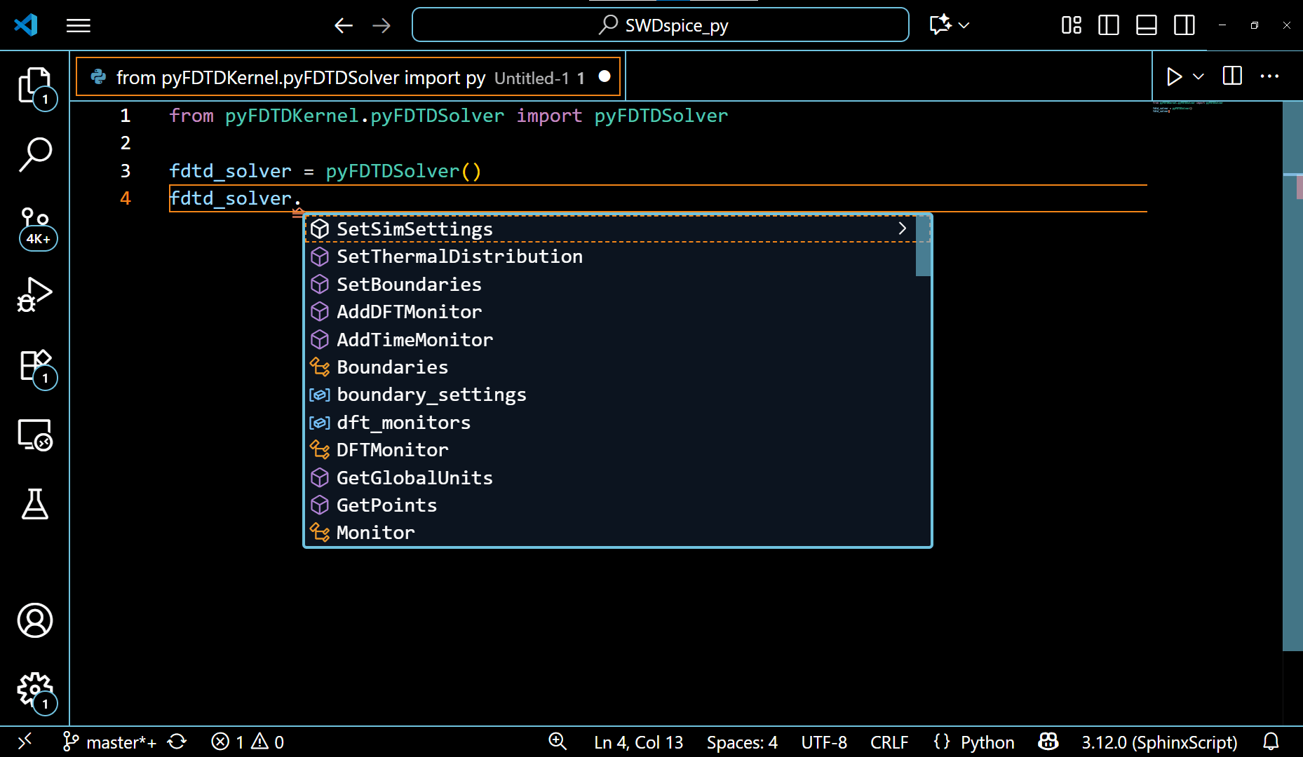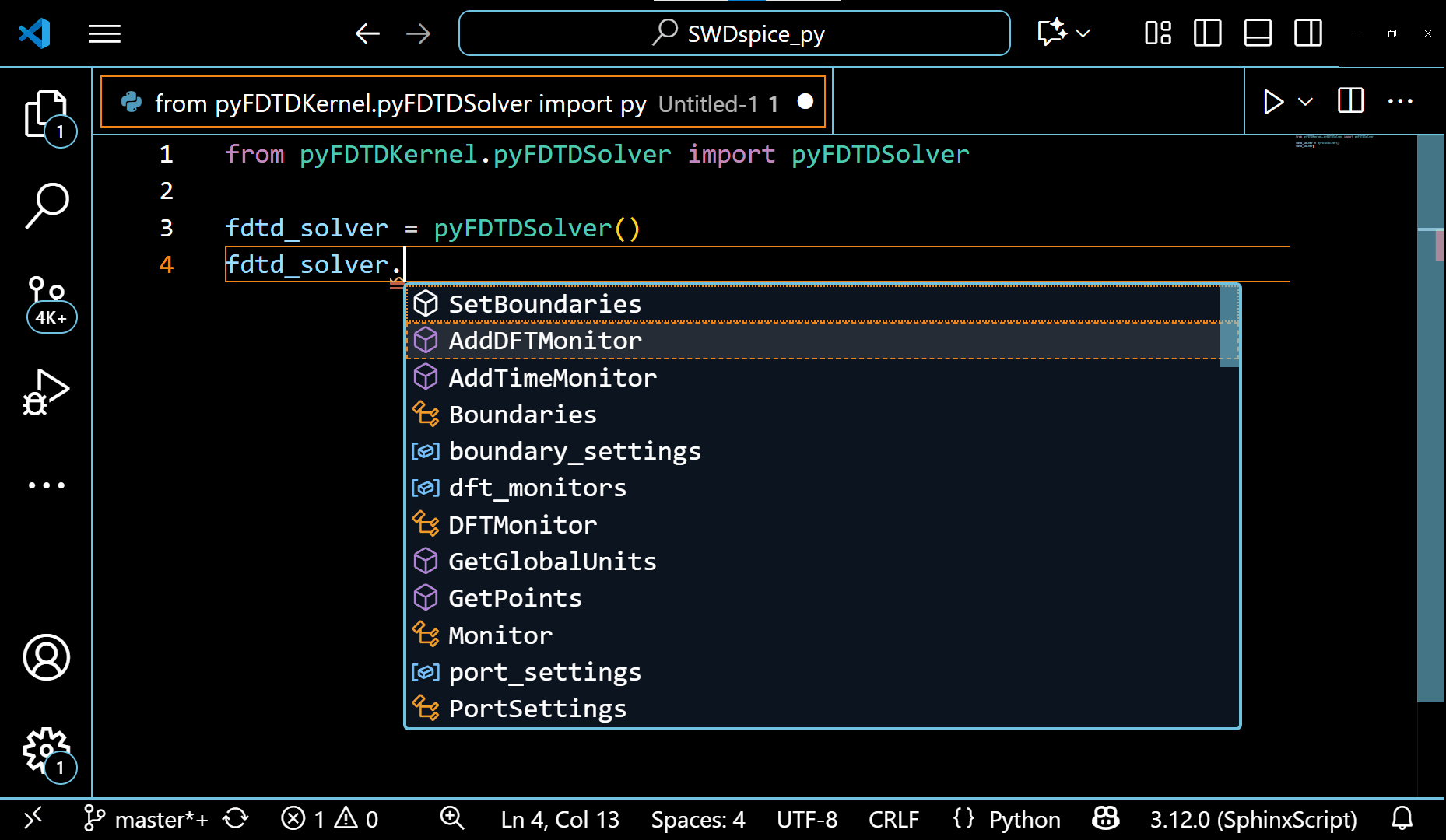 The VSCode editor automatically shows the methods under these classes and allows the auto-completion of the code. This also guides the python beginners to write a simulation code with ease.